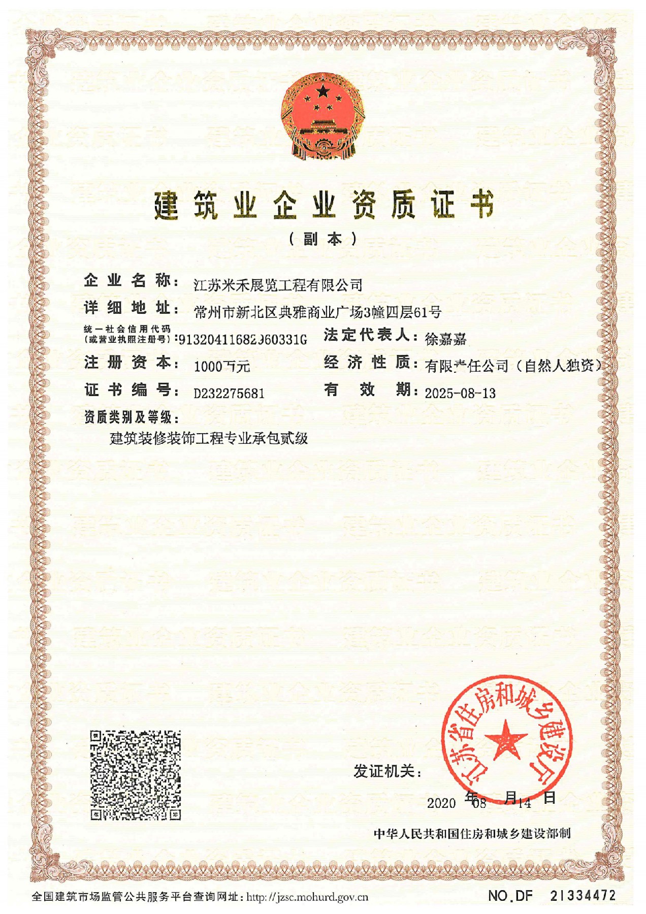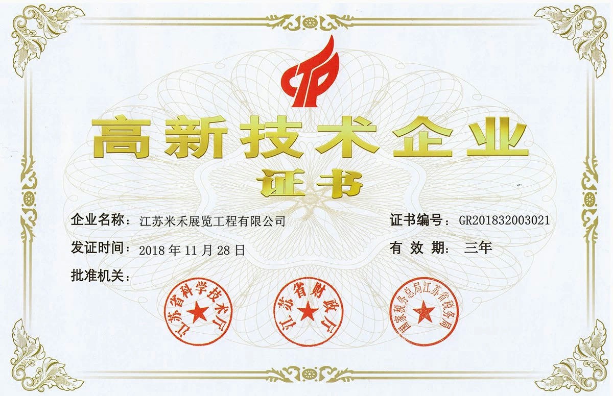 江苏米禾展览工程有限公司创立于2008年,注册资本1000万元,是国内高科技主题展馆设计营造一站式服务商。公司凭借“跨界整合”的发展思想,与各领域的专家、人才合作,使公司迅速发展壮大。公司先后取得了建筑装修装饰工程专业承包二级、建筑工程专项设计乙级、中国展览工程一级资质、中国展览工程设计施工一体化一级资质企业、多项国家专利,并通过ISO9001质量体系认证、ISO14001环境体系认证和AAA企业资信等级认证证书。获得了国家级高新技术企业、中国展览50强单位、江苏省民营科技企业、江苏省科技型中小企业。